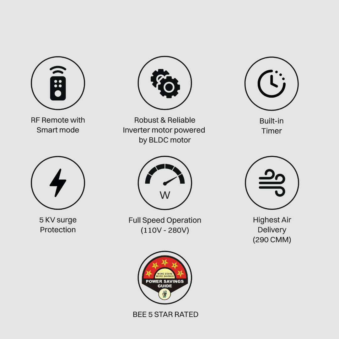 Remote, Built-In-Timer, 5KV Surge Protection, Robust & Reliable Inverter Motor Powered by BLDC Technology, Highest Air Delivery (>225CMM), Full Speed Operation (110V - 280V), Taiwan Technology, *Don't Use External Regulator.
