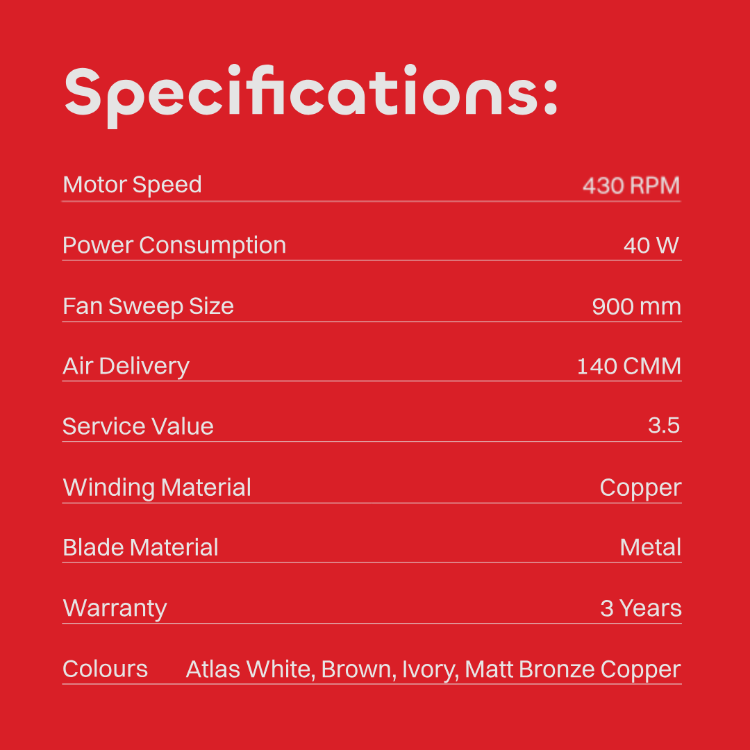 High Speed, Strong & Powerful Motor For Durability, Double Ball Bearing For Longer Life, Air Delivery (>140CMM), Elegant Looks With Stylish Bottom Cover And Canopy