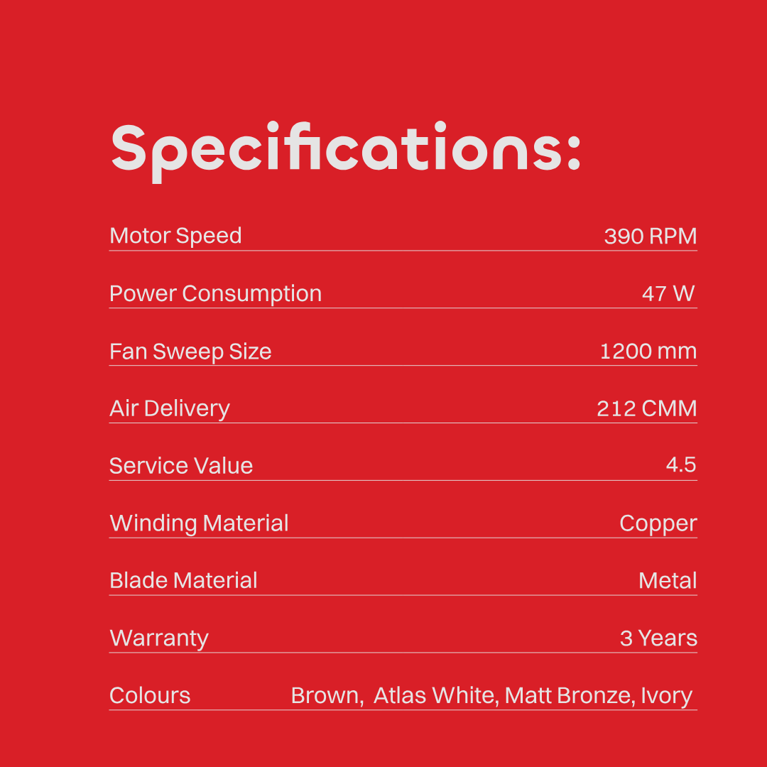 High Speed, Ribbed Blade for Strength, Strong & Powerful Motor for Durability, Double Ball Bearing for Longer Life, Air Delivery (>212CMM), Elegant Looks with Stylish Bottom Cover and Canopy