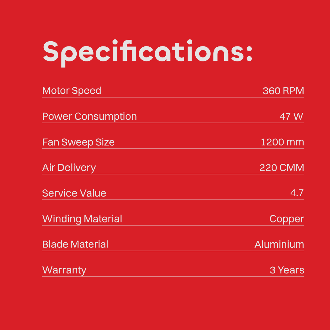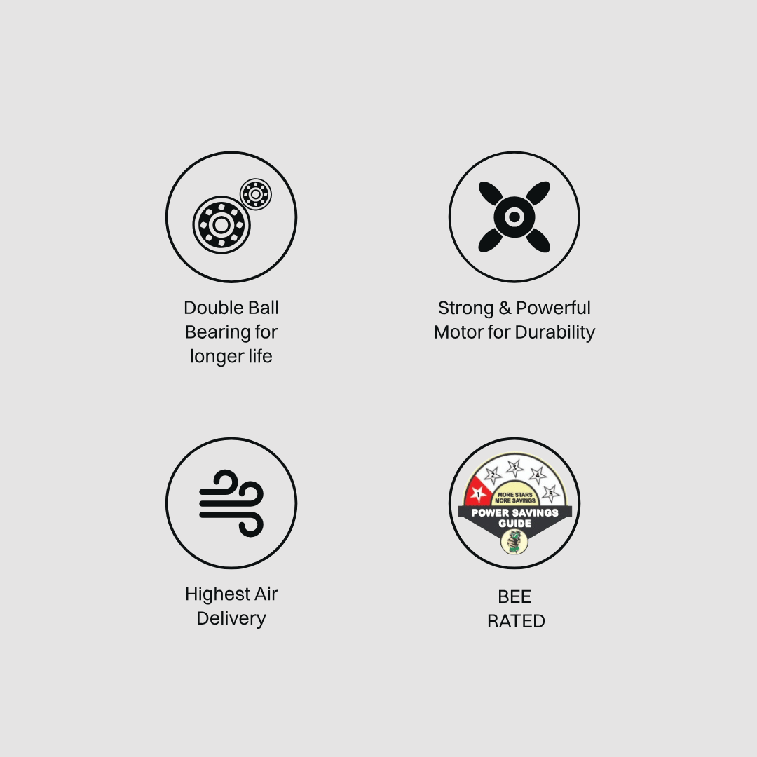 High Speed, Aerodynamic Blades for High Air Delivery, Strong & Powerful Motor for Durability, Double Ball Bearing for Longer Life, Air Delivery (>220CMM), Elegant Looks with Stylish Bottom Cover and Canopy