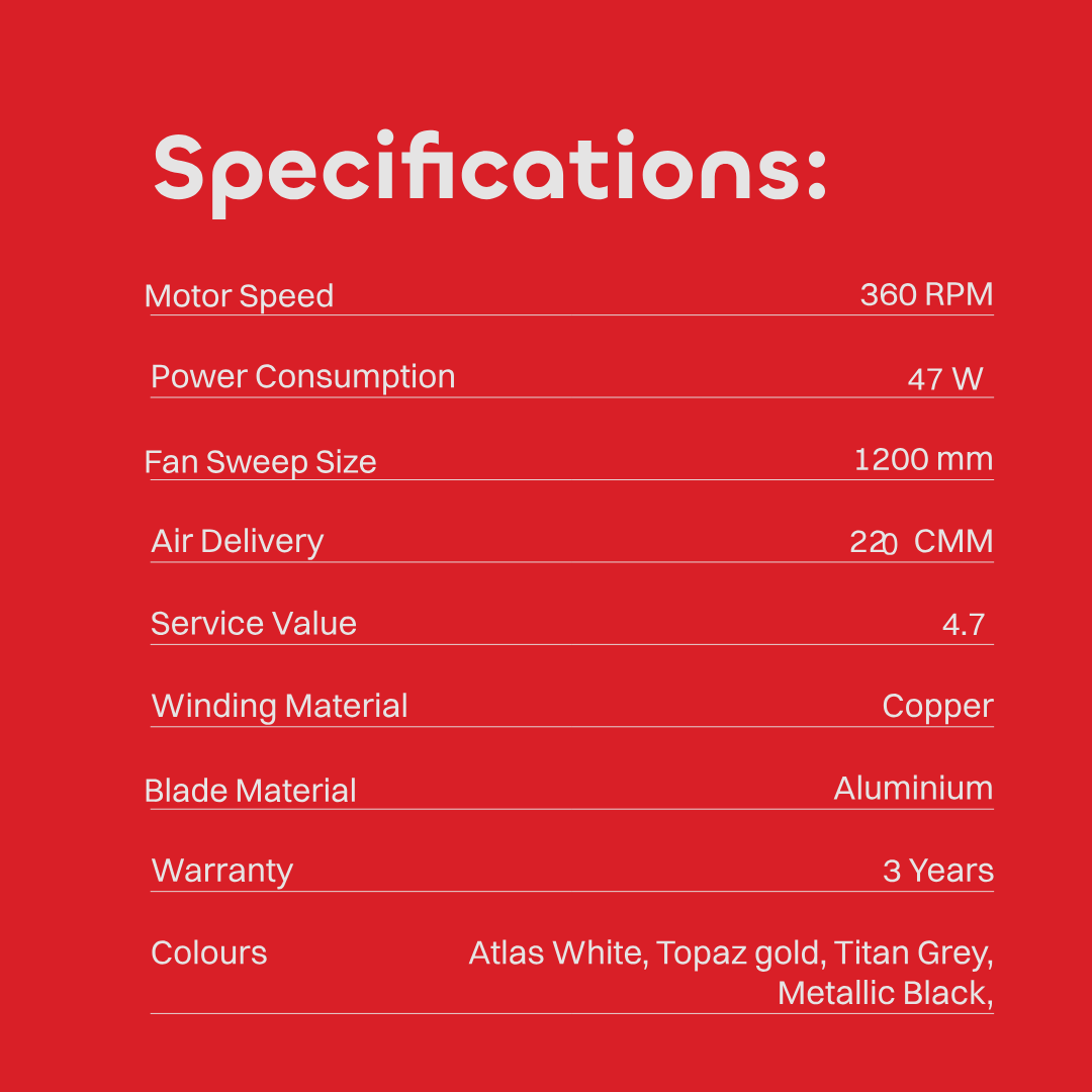 High Speed, Decorative Trims For Premium Look, Strong & Powerful Motor For Durability, Double Ball Bearing For Longer Life, Air Delivery (>220CMM), Elegant Looks with Stylish Bottom Cover and Canopy.